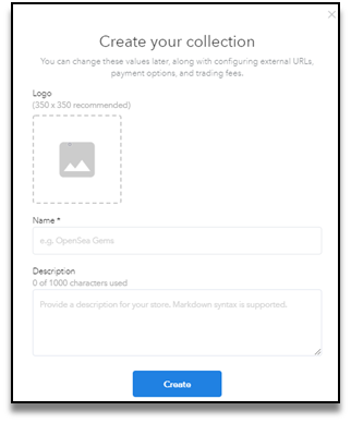 한번의 동의 사항과 메타마스크 서명을 합니다. 이제 컬력션 로고와 이름 그리고 설명을 작성하시면 됩니다.