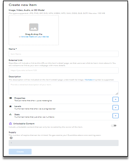 자신의 작품을 올릴 수 있는 양식화면이 생성됩니다. 내용을 채우시면 하단의 create 버튼이 활성화 됩니다.